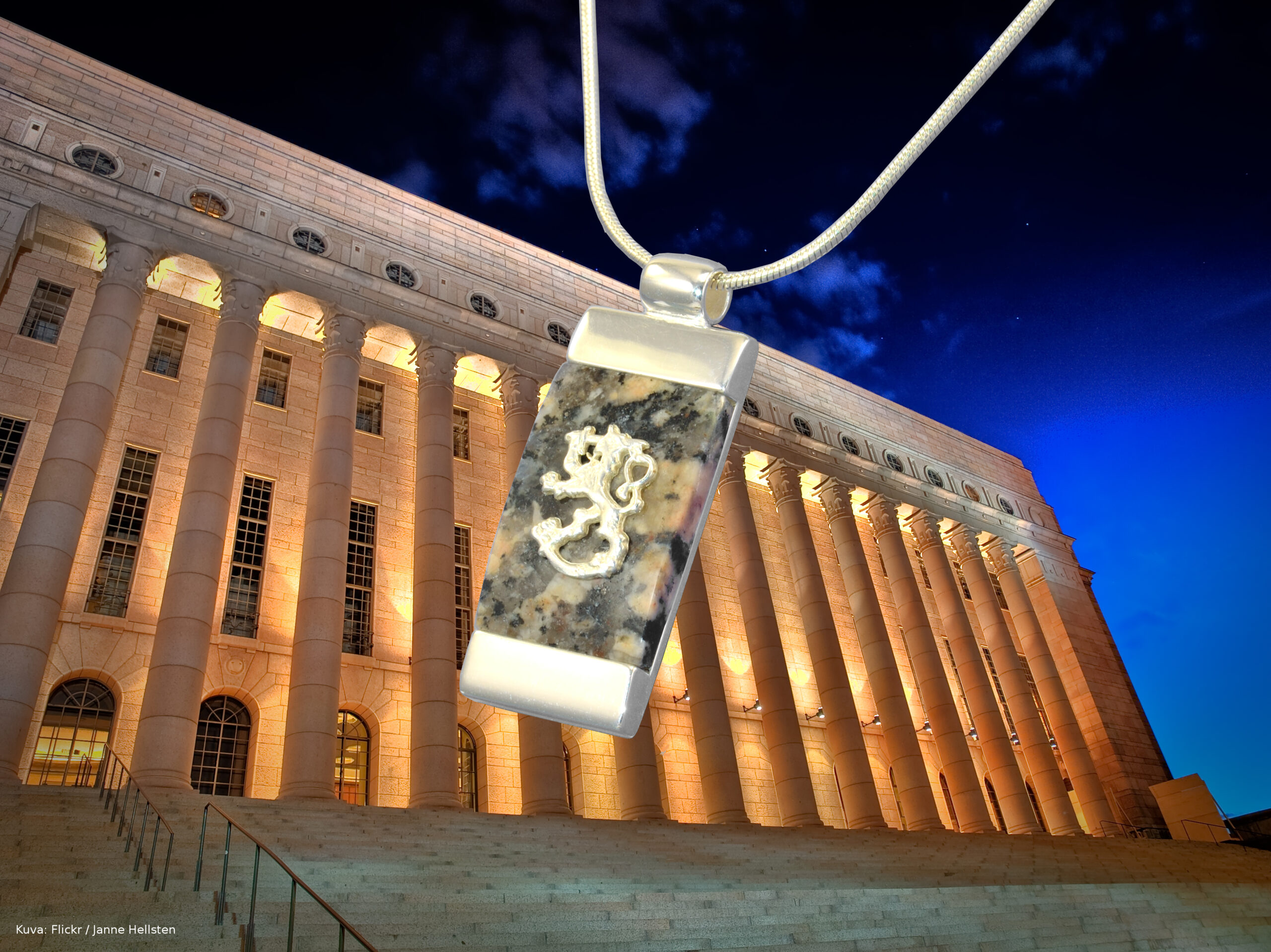• Riipus: Suomi-koru Eduskuntatalon kivestä hopeisella leijonalla.