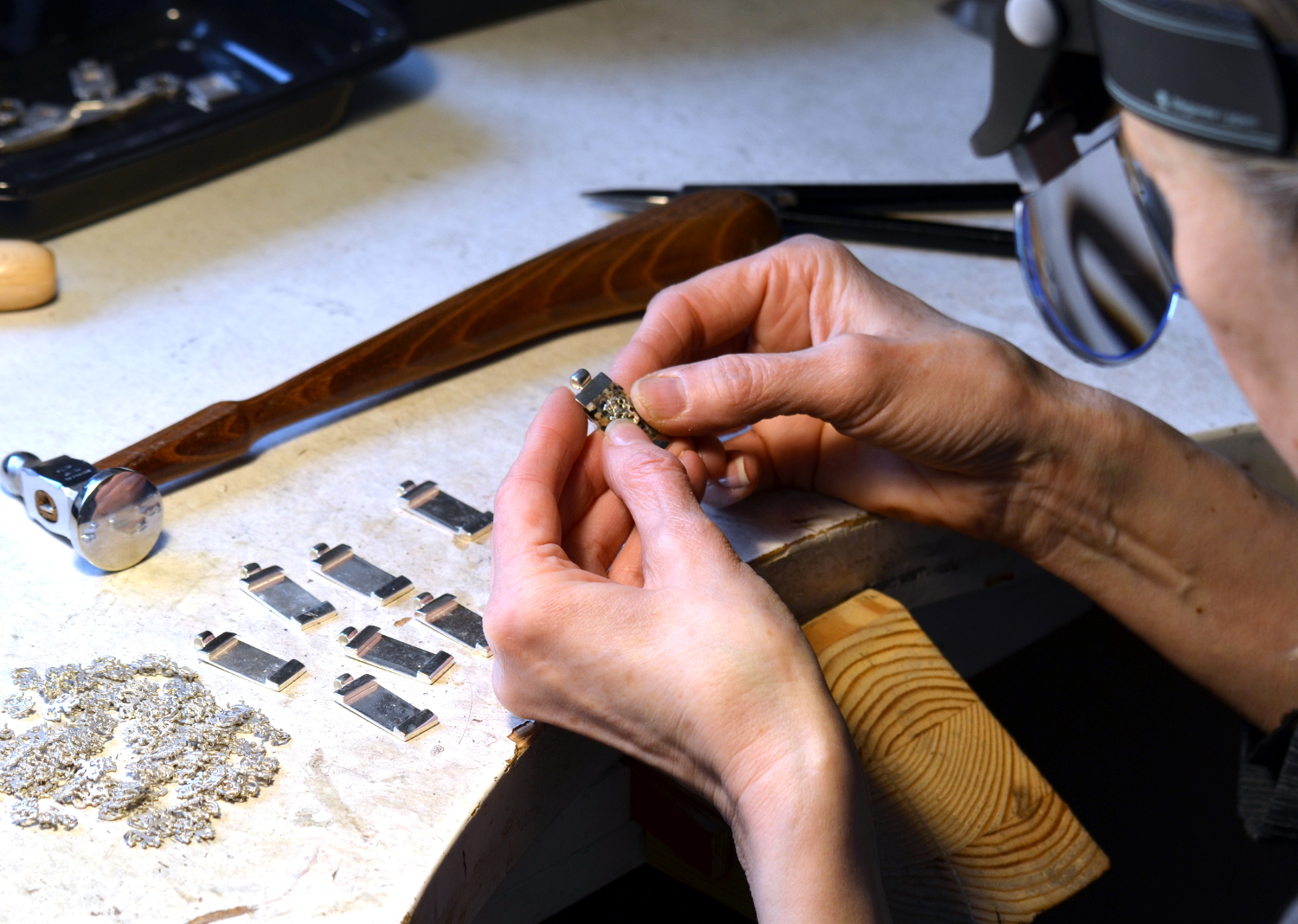 Suomi-koru Eduskuntatalon kivestä  ja 925 hopeasta.